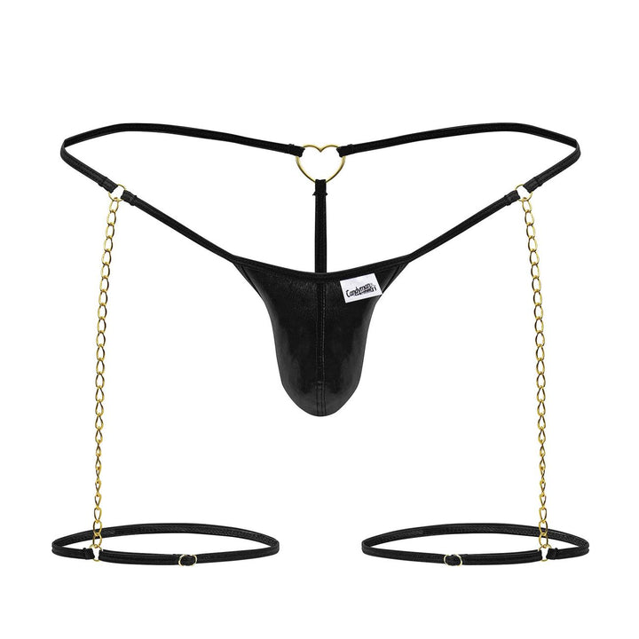 Dare to go bold! This ultra-revealing black thong with gold chain garter details is designed for those who own their confidence. With a sleek wet-look pouch, delicate chain accents, and a heart-shaped ring in the back, this piece is a showstopper from every angle. Sensual, daring, and unforgettable!