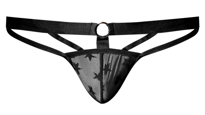 Make a bold and edgy statement with this sheer star mesh thong, perfect for those who love unique and provocative styles. The front pouch features a transparent fabric with a subtle star pattern, adding an intriguing touch, while the strappy design includes a metal ring detail for extra flair. The minimalistic thong back provides a barely-there feel, enhancing your physique with a flattering, daring silhouette. Crafted from soft, stretchy fabric, this thong offers a comfortable fit while bringing excitement to your collection.