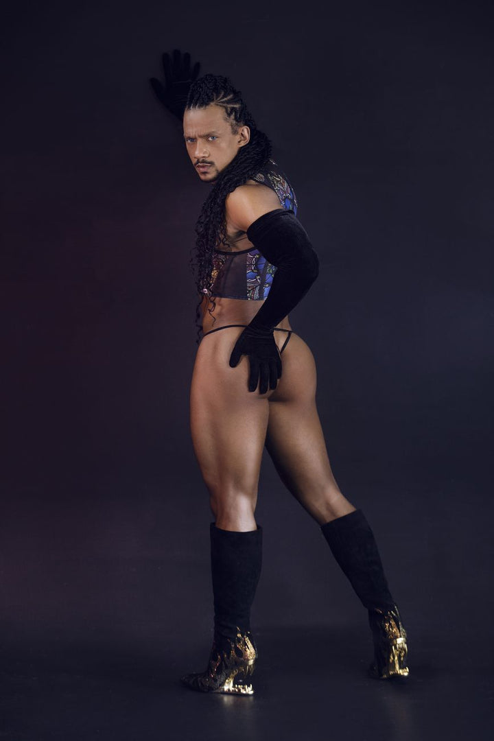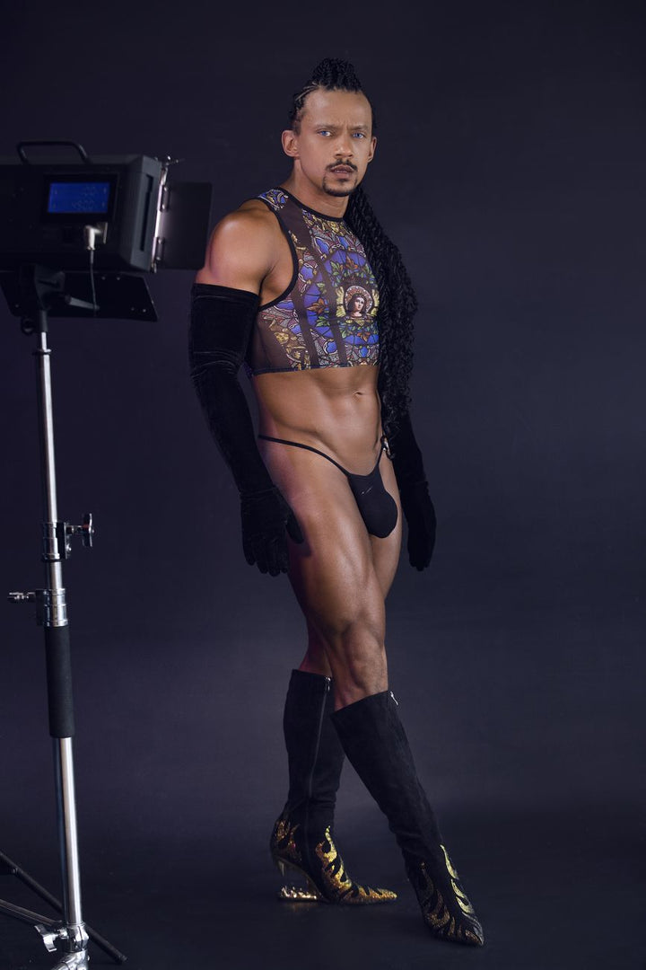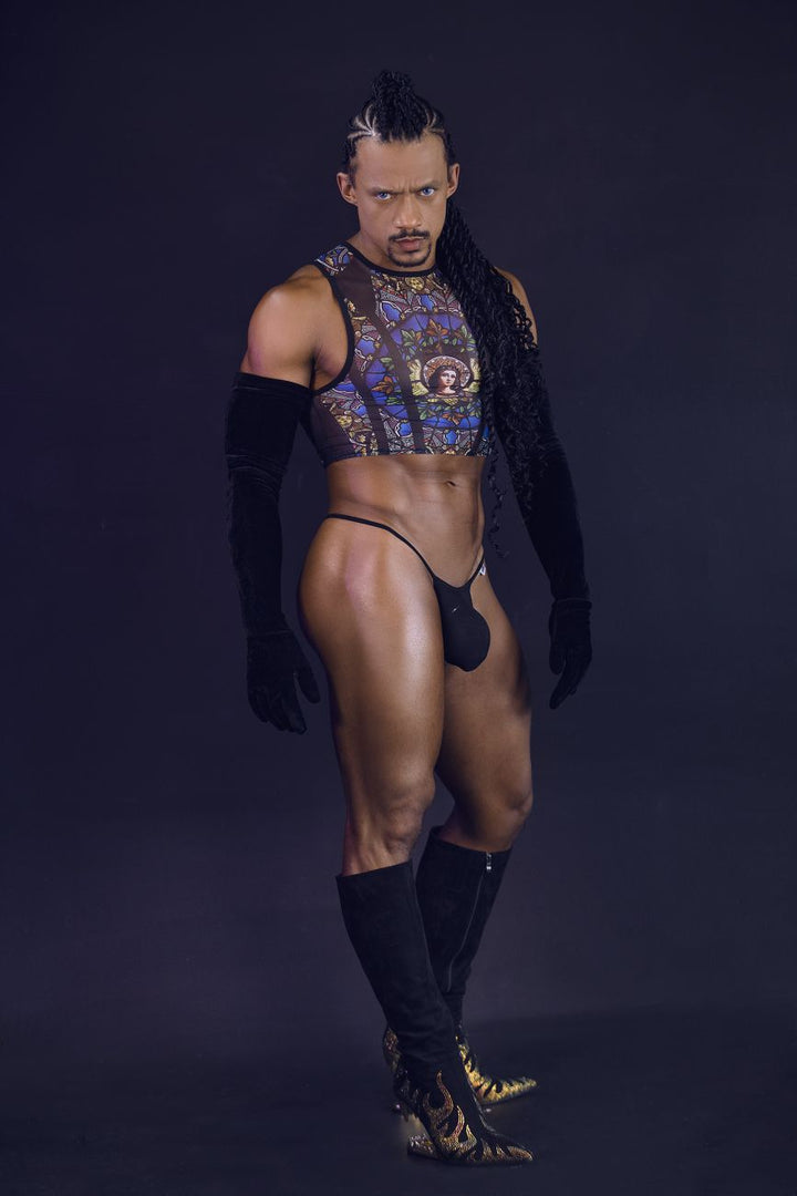 This striking men's crop top by CandyMan features a vibrant stained-glass window print, inspired by classic church art. The intricate design showcases rich colors and detailed patterns, creating a bold and artistic statement. The mesh fabric allows for breathability and comfort while the cropped cut adds a modern, edgy twist. This piece is perfect for those looking to mix artistic flair with daring fashion, making it ideal for bold styling in both casual and intimate settings.